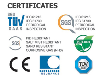 * AE Solar cam kết chỉ cung cấp những sản phẩm có chất lượng tốt nhất cho khách hàng. Do đó, tỷ lệ kiểm tra của hãng là 100% cho các nội dung kiểm tra trực quan, kiểm tra EL, kiểm tra áp suất, kiểm tra tải trọng cơ học và kiểm tra tuổi đảm bảo rằng các mô-đun quang điện của AE Solar hoạt động an toàn và trơn tru trong ít nhất 30 năm, với chế độ bảo hành sản phẩm là 12 năm. Do đó, mang lại sự an tâm và tin tưởng của khách hàng, đảm bảo lợi tức cao và ổn định cho các nhà đầu tư.